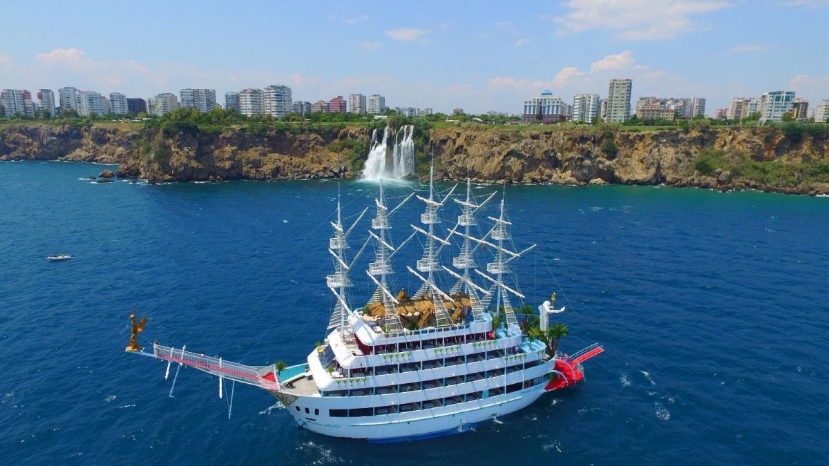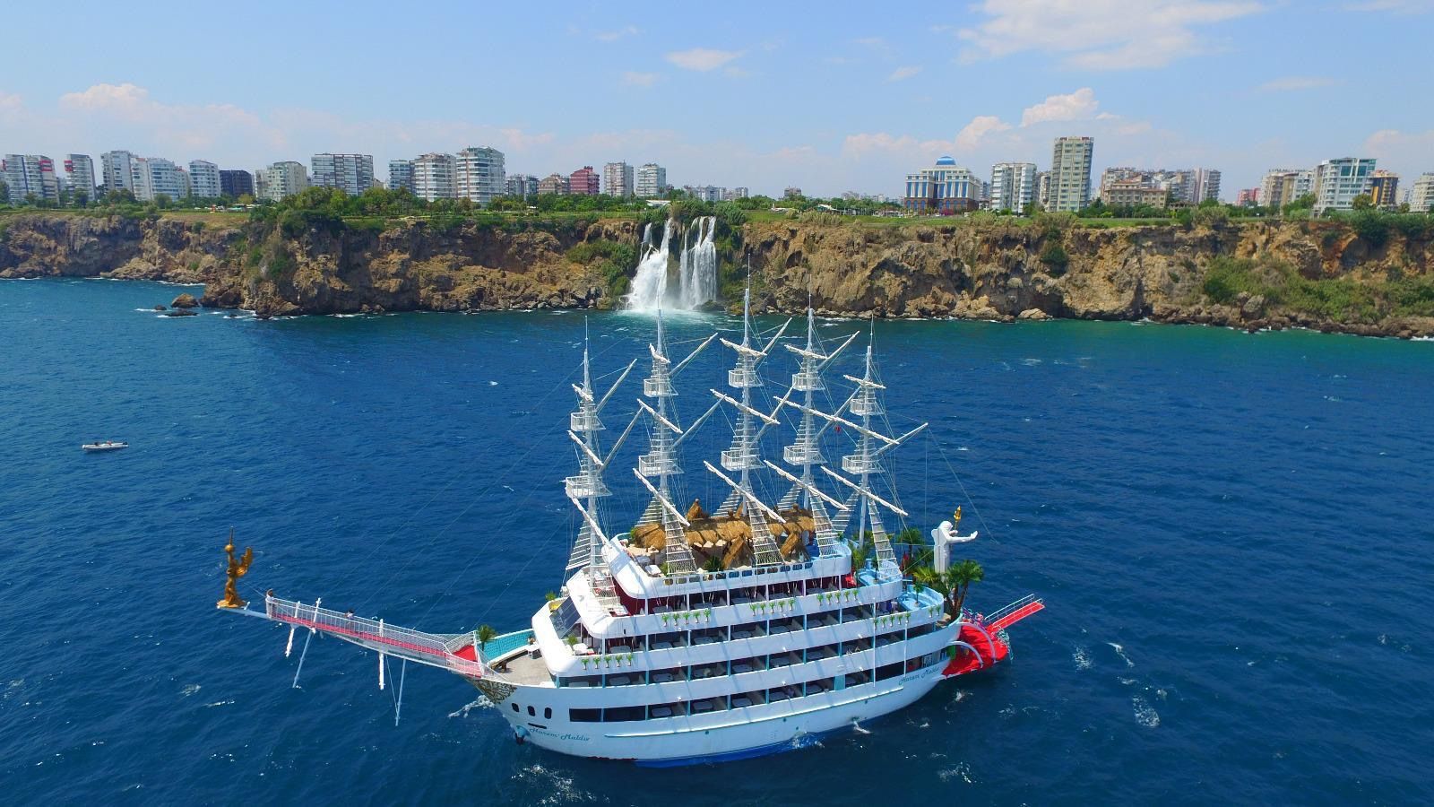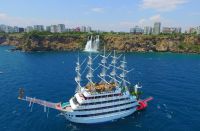 Предлагаем вам легкую и веселую прогулку по морю на величественной яхте Харем Мальдив. Пяти палубная яхта Харем Мальдив длиной 50 метров и вместимостью до 800 человек. Уже с первых шагов почувствуете всю масштабность яхты Харем Мальдив. Вас встречает анимационная команда с коктейлям, музыкой в ярких костюмах и уже с первых секунд ощущается веселое настроение. Проводя целый день на борту яхты Харем Мальдив Вы почувствуете всю роскошность отдыха на этом высококлассном судне. На протяжении всего морского круиза вы будете окружены заботой и вниманием. Яхта будет курсировать вдоль Анталийского побережья. Вы отправитесь в путешествие по самым живописным бухтам Анталии вдоль пляжей Коньяалты. Яхта плывет вдоль пляжей Коньяалты к гавани Старого города Калеичи и дает возможность сделать отличные фотографии. Для купания мы подобрали самые живописные бухты. У Вас будет возможность искупаться у скал Фалеза, Дюденского водопада и Черепашьего острова. В нашей программе для вас, развлекательные шоу от профессиональных аниматоров и танцоров. Шоу отдельно для взрослых и детей, шоу «танец живота» в традиционной гаремной атмосфере османских султанов, шоу со специально обученными попугаями. И, конечно же, вкусный обед — сытный шведский стол с несколькими видами блюд.